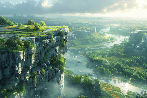 - «یک منظره کوهستانی هنگام طلوع خورشید با نور گرم و مه صبحگاهی.»